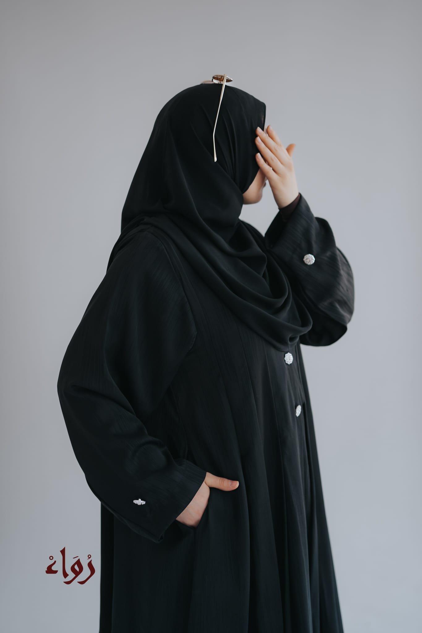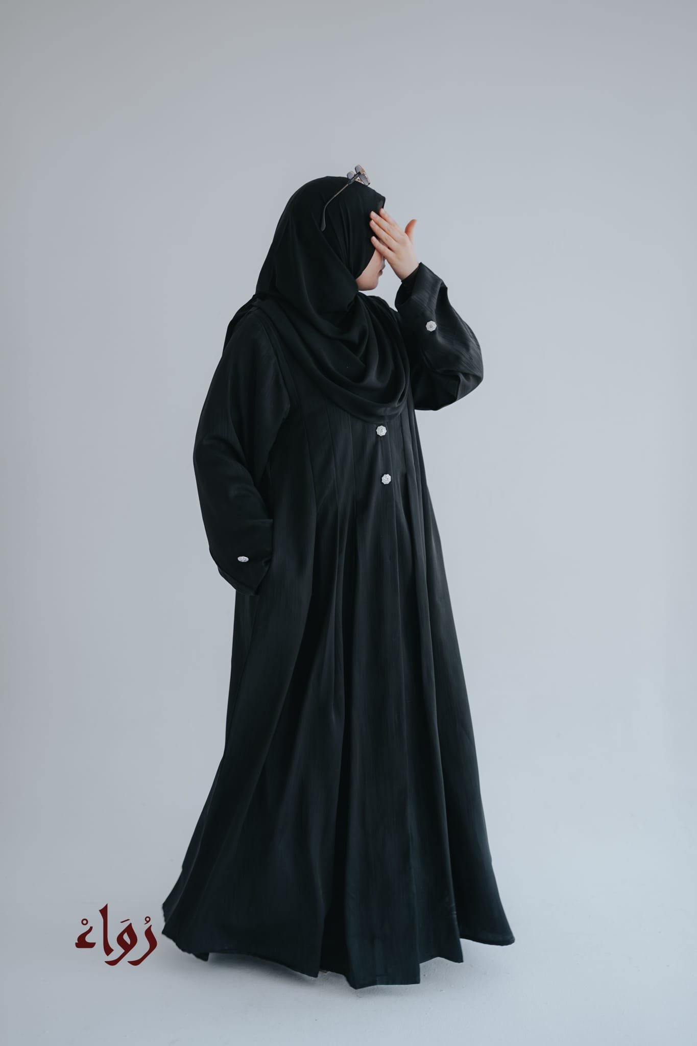 عباية سوداء أنيقة بتصميم كلاسيكي عصري، تجمع بين البساطة والفخامة في آنٍ واحد. تأتي بقصّة واسعة ومريحة تمنحك إطلالة راقية وانسيابية، مع أزرار أمامية مميزة تضيف لمسة ناعمة من الأناقة. مصنوعة من خامة عالية الجودة توفر الراحة طوال اليوم وتناسب مختلف المناسبات، سواء للإطلالات اليومية أو السهرات الهادئة.