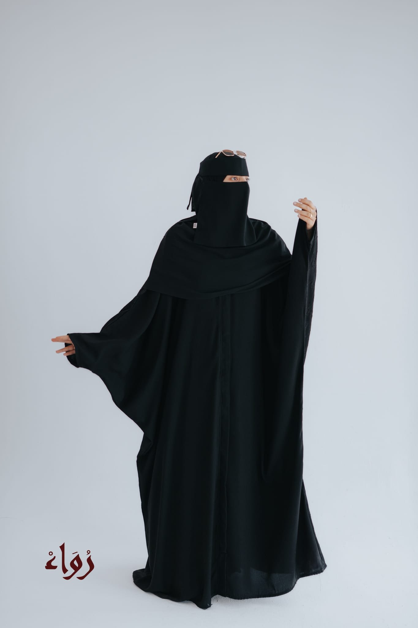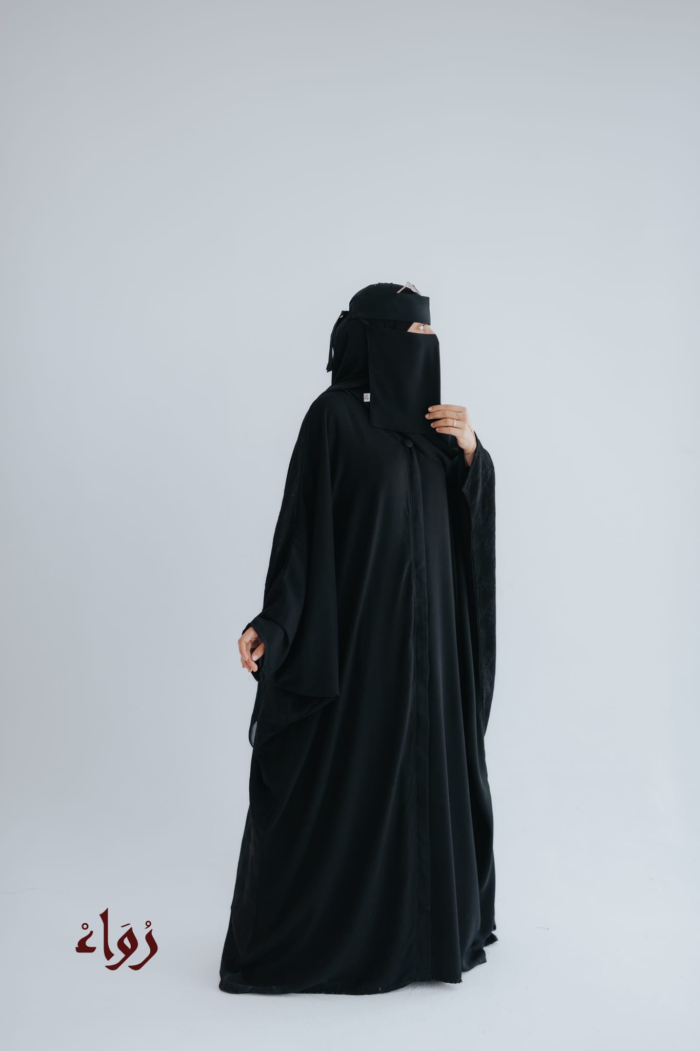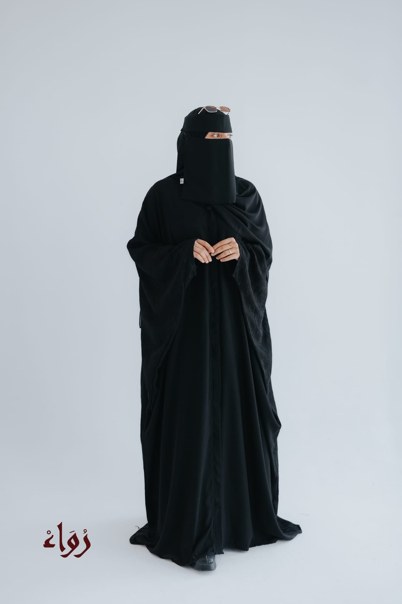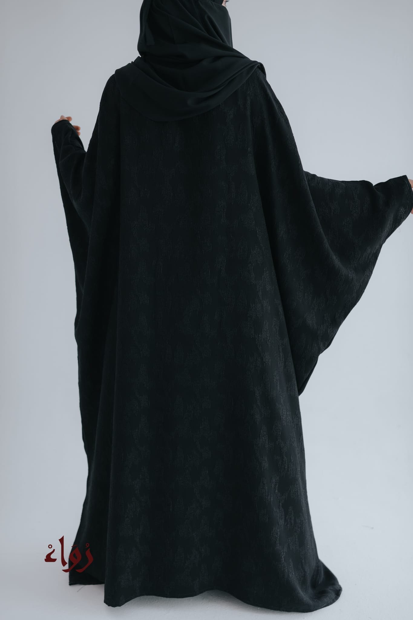 ملحفة سودة شيك جدًا بتصميم راقي يجمع بين الأناقة والبساطة، وشها كريب ناعم بملمس انسيابي يدي شكل مرتب وستاند فخم، وضهرها جكار مميز بنقشة راقية تضيف لمسة غنية وفخامة للقطعة